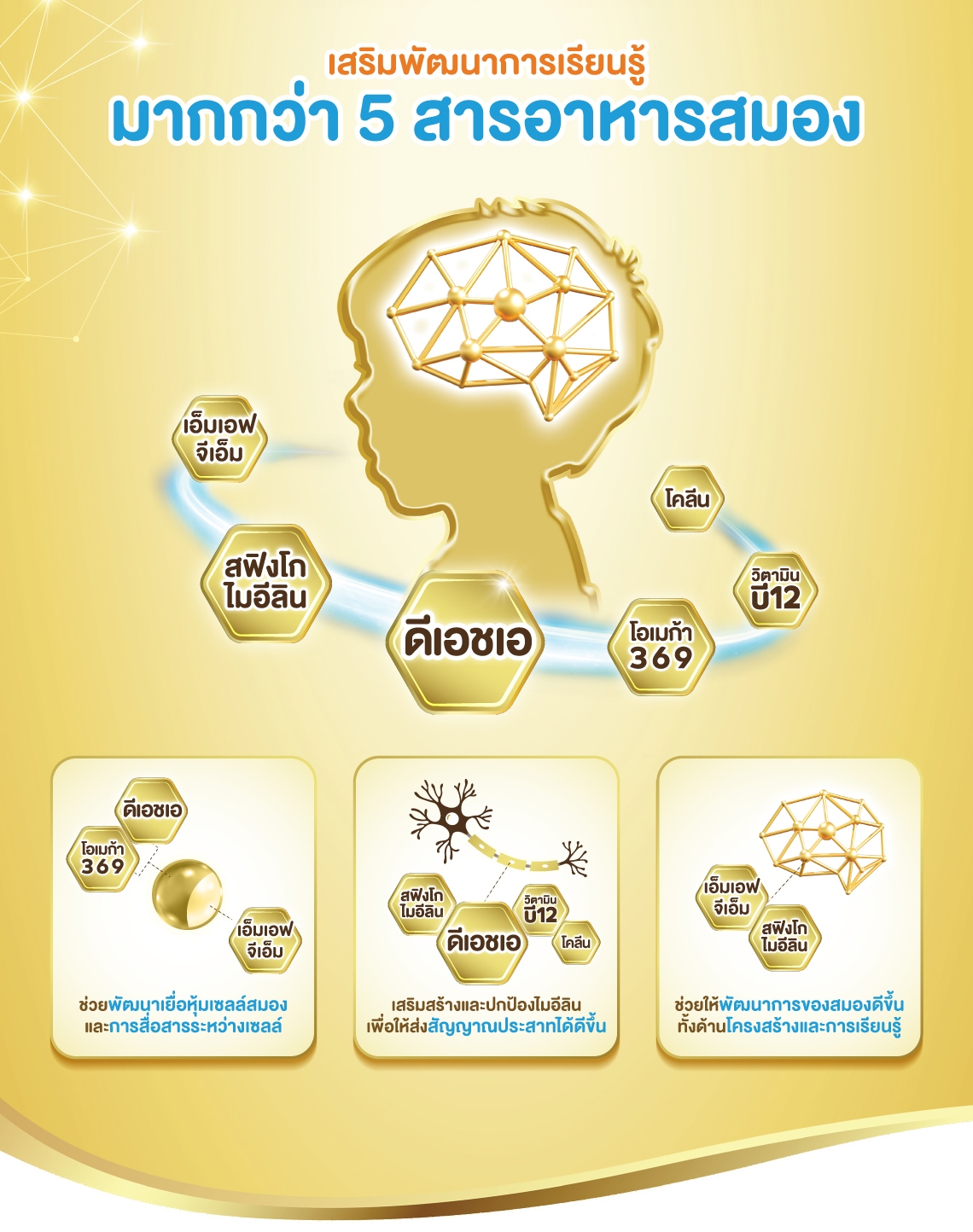 - DHA + Omega 3 + MFGM: ช่วยพัฒนาเยื่อหุ้มเซลล์สมองและการสื่อสารระหว่างเซลล์[11] [12]