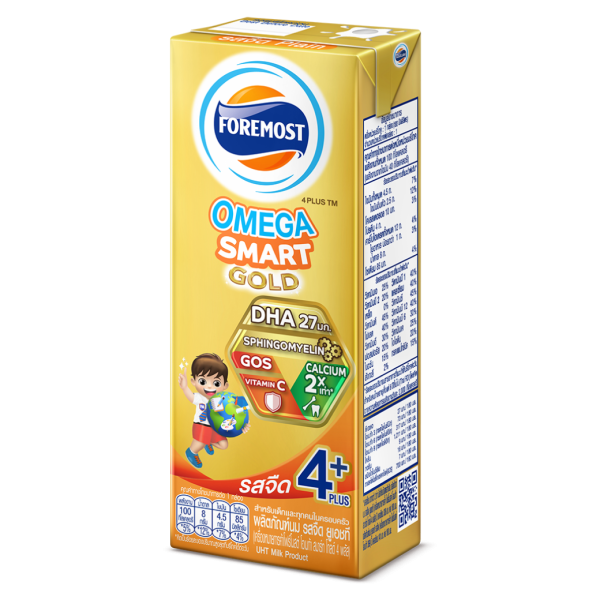 โฟร์โมสต์ โอเมก้า สมาร์ท โกลด์ 4 พลัส เป็น นมกล่องพร้อมดื่ม สำหรับเด็กวัย 3 ปีขึ้นไป ที่มี โอเมก้า 3, DHA, และสารอาหารอื่นๆ เพื่อช่วยเสริมพัฒนาการสมอง, การเรียนรู้, และภูมิคุ้มกันของเด็ก พร้อมทั้งช่วยเสริมสร้างร่างกายให้แข็งแรง