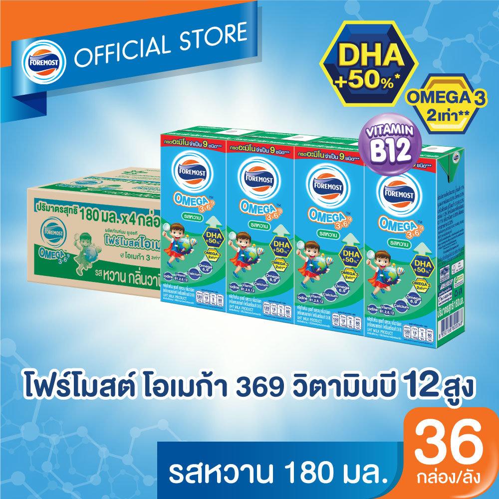 *ดีเอชเอเพิ่มขึ้นมากกว่า 60% เมื่อเทียบกับสูตรอ้างอิง, ผลิตภัณฑ์นม ยูเอชที รสหวาน กลินวานิลลา (เครื่องหมายการค้าโฟร์โมสต์ โอเมก้า 369) มี DHA 3.62 มก. ต่อ 180 มล. ผลิตภัณฑ์นมรสหวานยูเอชที (เครื่องหมายการค้าโฟร์โมสต์ คิด) มี DHA 2.55 มก. ต่อ 180 มล.
